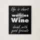Weniger Sorge mehr Wein, trinken Wein mit guten Freunden. Typografisches Design mit lustigem Zitat, lustiges Sprichwort. Funny Typografy Design mit Wein Zitat, Wein Sprichwort. Die Zitate aus dem Wein. Redewendungen mit sonnigen Weinen. Trinken Sie Wein, Weinliebhaber. Weindesign mit lustiger Typografie. Schwarzweißversion.