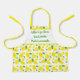 Eine Schürze mit dem Satz "Wenn das Leben dir Zitronen macht Lemonade" in grün und ein Muster lächelnder Zitronen und grüner Blätter auf weißem Hintergrund.