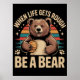 Diese ansprechende Abbildung zeigt einen freundlichen, lächelnden Bären mit einem goldenen Honigtopf. Der Bär ist ein Set gegen einen lebendigen, rückwärts inspiriert Streifen in warmen Farbtönen, mit subtilen Sternen und Pfotendrucken, die den Untertext flankieren. Der obere Text "WENN DAS LEBEN ROUGH WIRD" kurbelt über dem Bären, während "EIN Bär SEIN" unten mutig angezeigt wird. Das Gesamtdesign vermittelt ein Gefühl von Widerstandskraft, Kraft und Komfort, was auch in schwierigen Zeiten auf die Fähigkeit hindeutet, Süße und Ruhe zu finden.