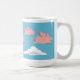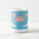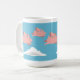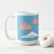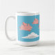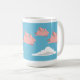 Eine Tasse, welche die Schweine fliegen über weiße Wolken gegen einen blauen Himmel darstellt.