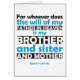 Ein biblisches Zitat, das uns alle unter der Liebe Jesu Christi zusammenbringt: Denn wer auch immer den Willen meines Vaters im Himmel tut, ist mein Bruder, meine Schwester und meine Mutter. Matthew 12:50 NIV