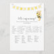 Ein lustiges Spiel für die Babydusche ist das Who is my mommy? Spiel. Dieses Spiel enthält oben ein gelbes Banner und einen Teddybär mit einer Biene. Auf der Rückseite ist ein Junge Teddy Bär, der auf einem Honigfass aufbaut und eine Honigbiene mit Vorlagen beobachtet.
