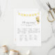 Ein lustiges Spiel für die Babydusche ist das Who is my mommy? Spiel. Dieses Spiel enthält oben ein gelbes Banner und einen Teddybär mit einer Honigbiene. Auf der anderen Seite ist ein Teddybär, der sich auf ein Honigfass stützt und eine Honigbiene mit Vorlagen beobachtet.