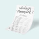 Viel Spaß beim Duschen mit diesem lustigen kleinen "Test" um zu sehen, wer die Mami am besten kennt! Fügen Sie Ihre eigenen Fragen und personalisierten Text mit dem Vorlagenformular hinzu. Verwenden Sie die Funktion "Weitere Einstellungen vornehmen", um die Hintergrundfarbe an das Party anzupassen. Verwenden Sie die Option mattes Papier zum Schreiben.