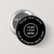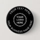 Schwarzer Werbe-Button für Ihr Unternehmen oder Ihre Organisation. Fügen Sie Ihr Logo oder QR-Code und zwei Zeilen mit individuellem Weißtext hinzu, z. B. Ihren Firmennamen, Slogan, danke, oder verlass leer.
