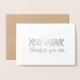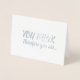 Feiern Sie eine große berufliche Leistung Ihres Kollegen, Freundes oder Liebes mit dieser Karte! Die Botschaft ist ein Stück auf dem Satz des Philosophen René Descartes "Je pense, donc je suis [Ich denke, daher bin ich]" ("cogito ergo sum"). Auf der Vorderseite der Karte steht: "DU DENKST", gefolgt von "daher bist du..." in silberner Folienbürste (Pinselstrich) drucken und Schriftzeichen. Öffnen Sie die Karte, die Formulierung wird fortgesetzt: "FÖRDERT! Herzlichen Glückwunsch!" in einem silbernen Ton. Perfekt für jede Art von Job oder Werbeaktion.