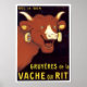 Vintage Label Art sind Papieretiketten, die seit den frühen 1880er Jahren verwendet werden. Sie wurden von europäischen Künstlern nach Amerika eingeführt, und dieser Druckprozess wurde als Lithografie bekannt. Dies war eine der ersten Formen kommerzieller Kunst. Dieses Bild ist von einer Vintagen französischen Käsehandlung. Ein lustiges Bild einer glücklichen Kuh, die runde Behälter Gruyere Käse als Ohrringe trägt. Ein perfektes Hausgeschenk für die neue Erwärmung.