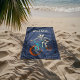 This beach towel is ready to be personalized with a name or other custom text. It features my hand drawn illustration of a werewolf skeleton riding a BMX bike. The comic book style graphic is in ivory, aqua blue and orange and set against a darker blue background. The edges of the towel have a blue on blue checkerboard pattern.
