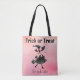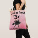 Eine hübsche kleine Hexe, die in ihrem schönsten Halloween-Kleid und ihrer Handtasche spaziert. Ihr Outfit ist schwarz mit blassrosa Polka-Punkten, gekräuselter Spitze und Bögen. Personalisieren Sie es unten mit der einfach zu bedienenden Vorlage. Design ist auf beiden Seiten. Der Hintergrund ist rosa Aquarell. Diese wertvolle Tasche ist ideal für Ihre Kleine, um zu Halloween Jahr für Jahr Süßigkeiten zu sammeln.