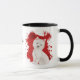 Ein niedliches Aquarellporträt eines West Highland White Terrier Hundes hebt sich vor einem hellroten, abstrakten Spritzer-Hintergrund ab. Das Bild befindet sich auf zwei Seiten der Tasse, mit Ihrem Namen oder einem anderen benutzerdefinierten Text in schwarz.