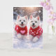 Feiern Sie den Valentinstag mit doppeltem Charme auf dieser herzlichen West Highland White Terrier Valentinstagskarte. Zwei fröhliche Westies, die durch den frisch gefallenen Schnee laufen und warme rote Pullover mit rosa Herzen tragen, zieren dieses Design, das alles einfängt, was Hunde-Liebhaber lieben - Verspieltheit, Treue und reine Zuneigung.