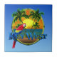 Key West Florida, die südlichste Stadt der Vereinigten Staaten. Sonnenuntergang mit Palmen, runder Bambusrahmen und farbenfroher Papagei über blauem Wasser.