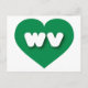 Auf dieser Postkarte befindet sich ein Öko-grünes Herz, das die fett-weiße, abgerundete Kleinbuchstaben wv enthält, eine spielerische Abkürzung für West Virginia, den Staat der Berge. Die Rückseite der Postkarte ist leer und wartet auf Ihren personalisierten Text oder Ihre handgeschriebenen Gefühle.