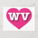 Diese Postkarte zeigt ein lebendiges und formschön rosa Herz mit den fett-weißen Großbuchstaben WV, der offiziellen Abkürzung für West Virginia, den Berg-Staat. Die Rückseite der Postkarte ist leer und wartet auf Ihre handgeschriebenen Stimmungen oder Ihren personalisierten Text.