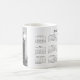 Die coole Tasse zeigt auf der einen Seite einen schwarzen 2026-Kalender, auf der anderen ein Schwarz-Weiß-Foto eines ungewöhnlich geschwungenen Gebäude mit einem Auto aus Western. Da das Schild nicht parallel zur flachen Seite des Backsteingebäudes verläuft, zeichne es die Aufmerksamkeit auf das halbrunde Design der Struktur. 35 mm, Schwarz-Weiß-Foto. Copyright ©Claire E. Skinner. Alle Rechte vorbehalten.