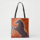 Ein perfektes einer netten Kunsttasche für Western, Pferd, das Gallonen liebt. Der aufrichtenkastanienmustang ist Set gegen einen kontrastierenden brennenden Hintergrund des orange Rotes.