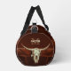 Diese braune monogramm rustikale Bullenduffeltasche mit dem braunen Western Cowboy-Alt-Design für ihn. Passen Sie dieses coole Herrenhaus an, das in einem antiken Stil inspiriert ist. Modernes Vintages Nutztier. Bildrecht Marg Seregelyi Fotografie.