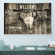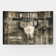 Rustikaler Western Stier Schädel mit Hörnern Vintage Art Hochzeitsempfang Begrüßungsbanner. Stallholzcowboy inspirierte Design. Antique sepia brauner Bison feines Kunstzeichen. Suchen Sie passende Produkte in meiner Shop-Kollektion. Bildrecht Marg Seregelyi Fotografie.