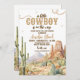 A western-themed baby shower invitation featuring a desert landscape, cacti, rope accents, and rustic typography. Designed for celebrating a little cowboy on the way, this invitation is ideal for western, cowboy, wild west, or country-inspired baby shower themes.