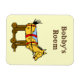 Ein bearbeitbarer Magnet mit Western-Buchstaben und Vintager Kunst eines Spielpferdes mit braunen Flecken auf den Rädern, restauriert aus einem Kinderbuch.