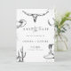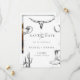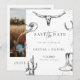 Feiern Sie Ihre Liebe mit dieser rustikalen westlichen Cowboy-Hochzeit "Save the Date"-Karte. Dieses Design enthält handgezeichnete westliche Illustrationen, darunter einen Longhorn-Schädel, Kaktus, Cowboystiefel, Hufeisen und Hut auf einem warmen Terrakotta-Hintergrund. Perfekt für Paare, die eine ländliche, Ranch- oder westlich inspirierte Hochzeit planen.