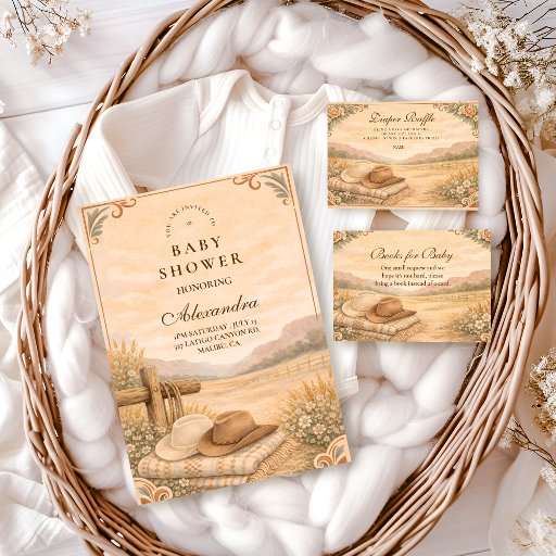 A soft western-inspired baby shower design featuring warm desert tones, delicate wildflowers, and a serene canyon landscape. The vintage western details and neutral palette create a calm, timeless look—perfect for a desert, ranch, or Southwest-themed celebration with an elegant, storybook feel.