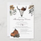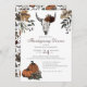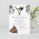 Dieser elegante Erntedank oder Friendsgiving lädt mit handgezeichnet Western Fall Harvest-Illustrationen in schwarzer Tinte ein und zeigt einen Kuhschädel mit Rose, Kürbissen und Herbstlauben. Die Rückseite weist ein schönes Muster mit diesen Elementen auf. Weißer Hintergrund.