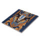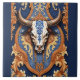 Western geschmücktes Leder Look Kuh Kopf und Damask Muster dekorative Keramik Fliesen. Ein majestätischer Bullenkopf mit aufwändigen blauen und goldenen filigranen Mustern, die an einen eleganten Damast erinnern. Der Schädel ist ein Kunstwerk, seine knochenweiße Oberfläche mit einem kühnen blauen Damast-Design, das im umliegenden Zierrahmen widerhallt. Die Komposition hat einen tiefen marinen Hintergrund, wo goldene barocke Schriftrollen einen luxuriösen Rahmen schaffen. Die Handwerkskunst verbindet Western und europäische Dekorationstraditionen und verwandelt so ein Symbol natürlicher Stärke in ein Emblem raffinierter Eleganz. Diese Kachel würde gut aussehen in einer Western-Küche oder in einer Menschenhöhle und ist ein gutes Geschenk für alle, die den alten wilden Westen Lieben.