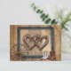 Rustikale Hochzeitskarte mit Western Stiefeln, hölzernem Herzrahmen, Seil und Wagenrad.