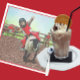 Western Rodeo Cowboy Cowgirl Mutton Busting mit LKW und Anhänger im Hintergrund und ein Cowboy am Zäune beobachten