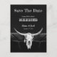 Western rustikales Land Vintag antike Cowboy-Stil. Fun Schwarz-Weiß Hochzeit speichern Sie das Datum Postkarte. Einladungen für den Schädel der Bullen. Benutzen Sie einen kleinen Spaß mit diesem niedlichen, lustigen Bauernhaus inspiriert Design. Alter wilder Westen, einzigartig. Cooles, trendiges Bauerntier. Personalisieren Sie Skripte und Typografie. Bildrecht Marg Seregelyi Fotografie.
