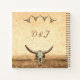 Western rustikale Hochzeitsbulle Kuh Schädel beige braun Vintage antike Stil quadratische Wendelbuch Gästebuch. Einzigartiger Landhausstil-Hintergrund. Wilder Westcowboy inspirierte Design. Vier Skulle in einem Muster mit individuelle Name und Datumsskript. Initialen auf der Rückseite. Trendy, coole, landwirtschaftliche Tiere Party. Bildrecht Marg Seregelyi Fotografie.