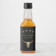 Western rustikale Hochzeitsbulle Kuh Schädel schwarz beige Vintage antike Stil Flaschen Etiketten. Altes Landhaus Stil Landschaft Hintergrund Design. Vier Skulle in einem Muster mit individuelle Name, Date Script. Der wilde Westkuhjunge inspirierte coole, trendige, landwirtschaftliche Party. Bildrecht Marg Seregelyi Fotografie.