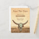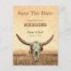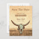 Rustikales Western Land Vintag beige braun antiken Cowboy Rodeo-Stil Hintergrund. Spaß Hochzeit speichern Sie das Datum Postkarte. Einladungen für den Schädel der Bullen. Nutzen Sie einen kleinen Spaß mit diesem niedlichen, lustigen Bauernhaus-Design. Alter wilder Westen, einzigartig. Cooles, trendiges Landtier. Passen Sie Ihr Skript an. Bildrecht Marg Seregelyi Fotografie.