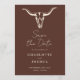 Western Save the Date - featuring a rustic bohemian western cow skull on an orange terracotta background. Save the Date is a simple design with script and modern lettering for a minimalistic design. All elements can be edited.