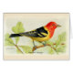 Vintag zeichn eines Westerns Tanager Vogel mit rotem Kopf und gelber Brust auf grauem Hintergrund. Dieser farbige zeichn des Westerns Tanager stammt aus der altmodischen Werbekartenreihe Arm and Hammer Baking Soda.