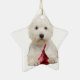 Westhochland-Terrier-Posen mit einem Süßigkeitskuß und wird auf einer Keramik Weihnachtsverzierung gekennzeichnet.