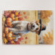 Ein Aquarellbild eines fröhlichen Hundes inmitten eines Haufen lebendiger Herbstlaub, umgeben von winzigen Kürbissen und verstreuten Eichhörnchen. Der Hund trägt einen kleinen Pilgerhut und strahlt vor Freude aus, um den Geist des Erntedanks zu erfassen. Im Hintergrund sorgen weiche Erntefelder und goldfarbene Bäume für eine friedliche Landschaft. Die sanfte Struktur und die warmen, gedämpften Herbsttöne verleihen der Szene ein gemütliches, nostalgisches Gefühl, das perfekt ist, um die Schönheit der Saison zu feiern.