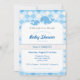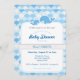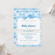 Niedliche Babydusche Einladung in einem blauen Farbschema mit Waldarstellung und geometrischem Muster-Hintergrund.