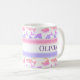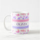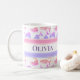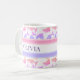 Niedlich rosa, lila und gelb personalisiert mit Namen Kaffee Tasse mit süßen Walen schwimmen darauf. Ein perfektes Geburtstagsgeschenk, Hauswärmung, Weihnachtsgeschenk.