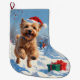 Wheaten Terrier läuft im Schnee mit Weihnachtshut Großer Weihnachtsstrumpf