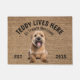 Wheaten Terrier Personalisiert Hundeliebhaber willkommen vor der Tür. Diese Begrüßungsmatte kann mit dem Namen Ihres Hundes personalisiert werden, der Slogan kann auch geändert werden oder Sie können ein Foto Ihres eigenen Hundes verwenden (stellen Sie sicher, dass es transparent ist). Text liest: Teddy wohnt hier... Alle Leckereien begrüßen das Bearbeiten des Designs, um den Schriftart, die Farben und die Hintergrundfarbe zu ändern. Verwenden Sie beim Ersetzen des Hundes ein transparentes Bild. Ein wunderbares Geschenk für ein Party, Ferien, Hundefreunde und für jeden Anlass.