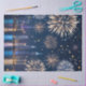 This variation deepens the sense of celebration by adding reflection and symmetry. A glowing city skyline stretches along the edge, mirrored in calm water, while fireworks bloom overhead in radiant bursts of gold and white. Confetti drifts across the night sky, catching light like scattered stars.