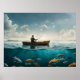 A lone fisherman in a wooden boat casts his line into a calm, cloudy sky while various fish swim beneath the surface of a clear blue lake. The serene scene juxtaposes the solitary figure above water with the bustling underwater life.