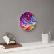 Diese Wanduhr hat ein farbenfrohes Design aus gefiederten Pinselstrichen in einem leichten Schmetterlingsdesign auf einem lila Hintergrund.