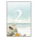 Diese Tischnummer mit ihrem weißen Sandstrand ist ein entspanntes Küstenambiente, in dem sich verschiedene Elemente wie z.B. aus Stressholz, Plumeria und anderen, am Strand inspiriert Motiven befinden. Die Farbpalette ist in Blau-, Grün- und Sandbeige gehalten und erinnert an den Ozean und den Strand. Das Gesamtdesign ist lustig und romantisch und eignet sich perfekt für eine inspirierte Hochzeit an der Küste.