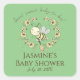 Whimsical Baby Dusche quadratische Aufkleber mit einem niedlichen Bienen und Blume Kranz mit individualisierbarem Text auf grünem Hintergrund. Verwendung für Gastgeschenke, Umschlag Aufkleber und Geschenktaschen