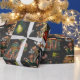 Whimsical Packpapier mit handgemalten Illustrationen von festlichen Pilzen. Ein fröhlicher Pilz baut einen Schneemann vor ihrem roten Pilzhaus. Ein Frosch und eine Kröte genießen eine heiße Tasse Kakao. Und eine Schnecke trägt ein Weihnachtsgeschenk durch einen Pilz- und Zuckerrohrwald.