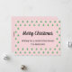 Sie können schwarzen Text mit Ihrer personalisierten Nachricht und Ihrem Namen personalisieren. Oben können Sie das schwarze Skript anpassen, das "Frohe Weihnachten" sagt. Es gibt zusätzlich schwarzen Anzeigetext, den Sie bearbeiten können, um Ihren Namen und Ihre benutzerdefinierte Nachricht anzuzeigen. Diese blassrosa Urlaubspostkarte hat ein Muster von grünen Weihnachtsbäumen auf der Vorderseite. Die Rückseite ist blassrosa.