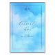 This wedding tabletop sign features a soft, watercolor-style background in shades of blue, evoking the serene beauty of a cloudy sky. The design includes elegant cursive typography for "dessert bar" and a playful sans-serif font for "PLEASE HELP YOURSELF," creating an inviting atmosphere perfect for a relaxed gathering. With ample negative space and a minimalist yet whimsical style, this sign encourages guests to indulge freely while adding a touch of charm to any event. Its customizable name placeholder at the top allows for personalization, making it ideal for weddings or parties where a friendly and approachable vibe is desired.